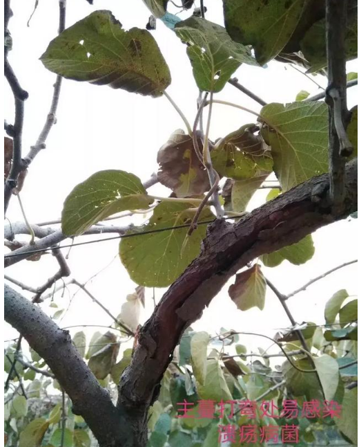 2、用徒长枝或徒长性结果枝,也就是虚旺枝年年做结果母枝,结果导致徒长枝上长徒长枝,旺上加旺,形成恶性循环,树体旺势无法停止,营养生长和生殖生长严重失调,导致猕猴桃溃疡病泛滥蔓延,无法控制。