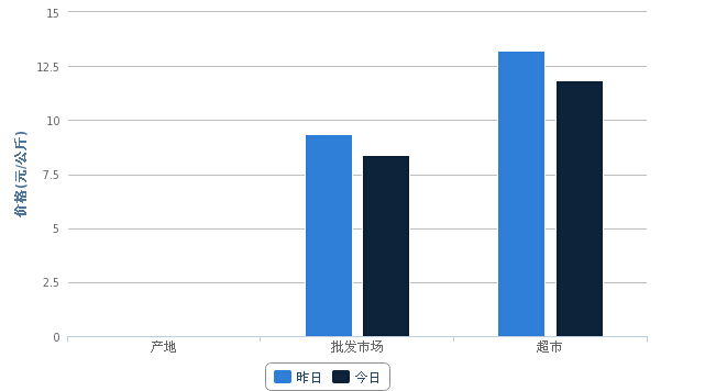 2014年11月25日猕猴桃批发市场价格为8.41元/公斤,超市价格为11.85元/公斤,批发市场价格下调,超市价格下调。