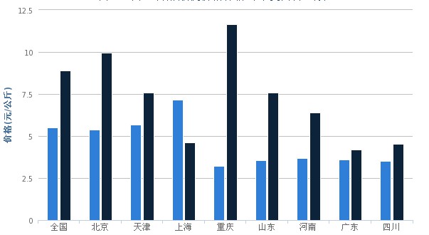 监测中心数据显示: 2014年4月15日猕猴桃批发市场价格为8元/公斤,去年同期为5元/公斤。出现了上涨,去年是5.52元/公斤,今年是8.89元/公斤,山西出现了上涨,去年是3.68元/公斤,今年是6.41元/公斤,内蒙古出现了上涨,去年是3.6元/公斤,今年是4.19元/公斤