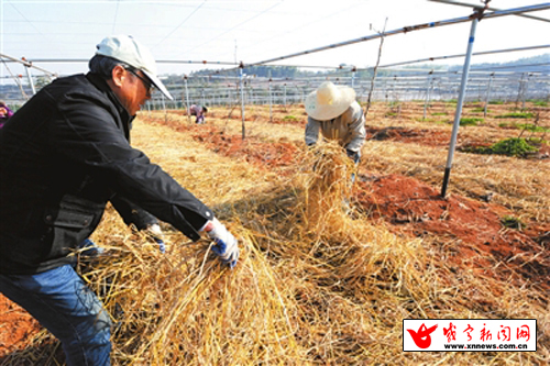 4日,咸安区官埠桥镇信德现代农业科技有限公司猕猴桃示范推广基地,员工正在为越冬的猕猴桃幼苗铺盖稻草,为幼苗的春季生长打好基础。据介绍,该基地建成后,通过高投入,高产出,进入高端市场,为猕猴桃产业发展创造一种全新模式。