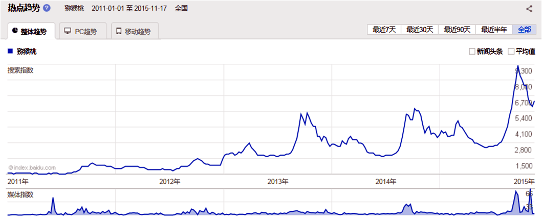 通过百度2011-2015年的猕猴桃搜索指数数据显示,近年猕猴桃的关注度呈周期性逐渐提高,表明该产品目前发展势头良好,市场规模正在逐渐扩大。