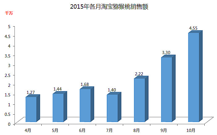 猕猴桃目前在淘宝市场平均每月销量在1千万元以上,在8月开始猕猴桃陆续成熟后,9月10月猕猴桃销量陆续上涨,销售高峰月份销量达到4.55千万;此数据也表明今年电商客户对猕猴桃需求增大。