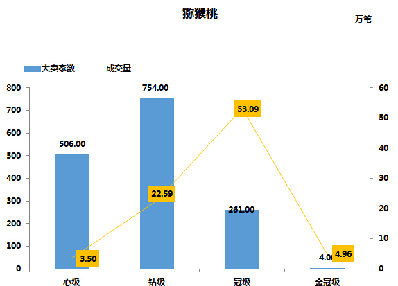 根据入驻电商平台的竞争环境,合理制定阶段性销售目标。下图数据表明,10月份淘宝市场261家冠级猕猴桃卖家成交量53万达到笔,而754家钻级卖家的猕猴桃销量只有23万笔。