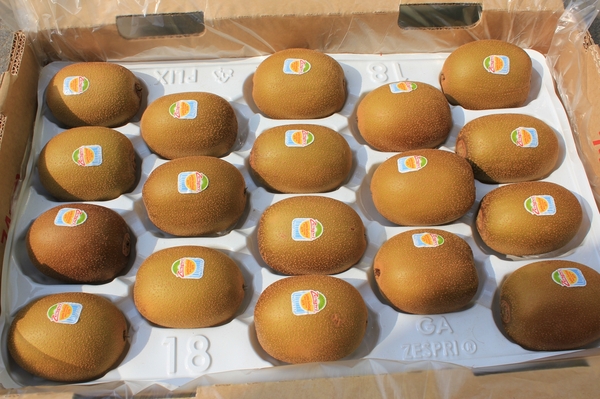 侯俊文告诉记者,批上市的奇异果都是阳光金果,绿果要到五月中旬才能上市。一箱奇异果的重量在3.3公斤以上,根据果子大小,分别装有18-36颗果子。其中,18颗装的只占总量的1%,是奇异果中的果王,大的一颗重量达200克左右。