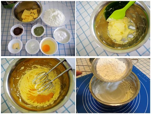 6. 大面团加入抹茶粉、中份面团加入玉米淀粉、小面团加入可可粉,分别混合均匀成面团;可可面团放在保鲜袋中擀成薄片,黄色面团搓成长条圆柱形,用抹茶面团包住黄色圆柱形长条,外面再用可可面团包裹住 冰箱冷藏几分钟取出 切片, 表面刷蛋液,在黄色面团的边缘处沾些黑芝麻