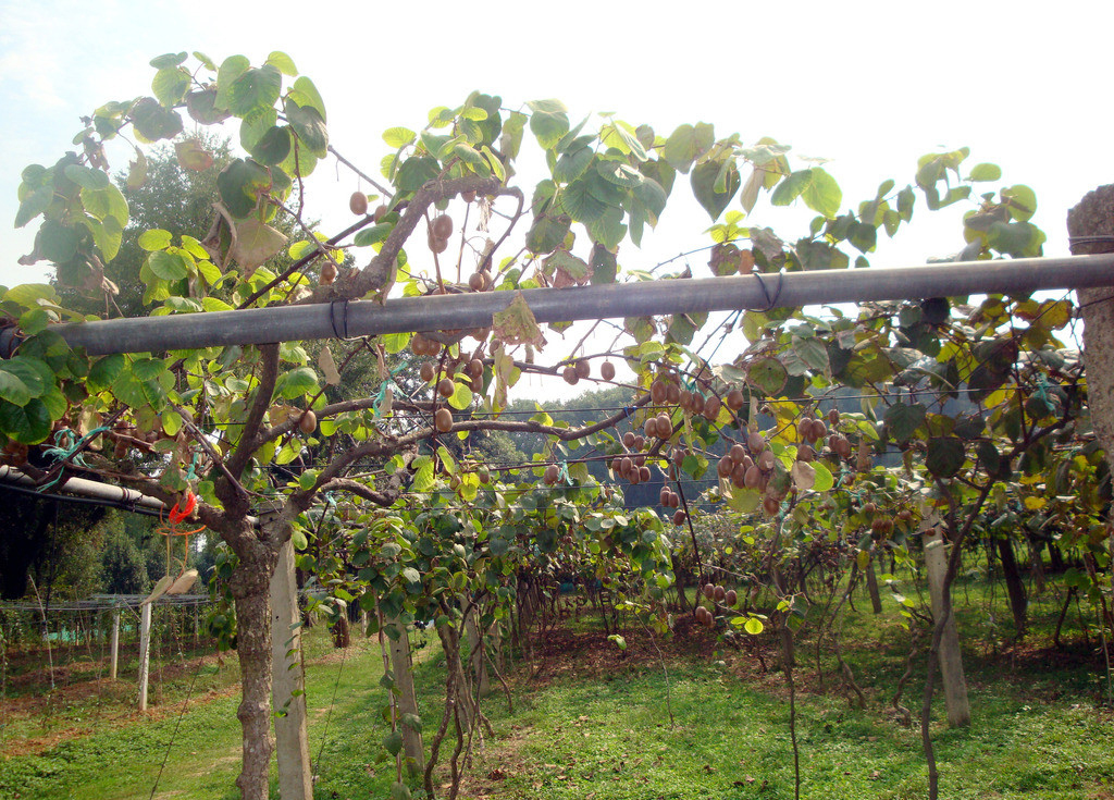 猕猴桃能否丰收,与给树“上刑”有何关系?“关系可大了,其中也有它的科技含量哩。”张琳怀告诉记者,猕猴桃树在修剪完后,就要按照树冠的空间,及时把留下的挂果枝条均匀地绑扎在铁丝上,摆放的密度既不能小,也不能过大。而有些作务果树的新手,恨不得让树一年能挂上两年的桃子,枝蔓的绑扎密度过大,这样做的结果是果子的个数虽然多了,但个头小,果形差,商品率较低,销售不好,也收不到好效益。这是因为搭架(铁丝)的枝蔓过密了,就会影响通风透光,不利于果子的正常膨大。记者在这位果农的园里注意到,绑扎在铁丝上的枝蔓之间的空间距离均在 10至15厘米,每棵树呈“打伞形”,整个果园整齐划一,一眼便能看出这是“能人”作务的“科技园子”。