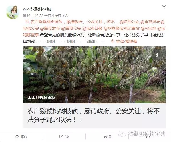 据新浪微博网友“木木只爱林来疯” 爆料:六月四日晚,宝鸡市某地五家农户猕猴桃树被不法分子一夜之间全部砍断!!四百余棵猕猴桃树。