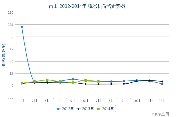 2014年7月12日猕猴桃批发市场价格为8.48元/公斤,图示为今年以来猕猴桃的价格走势和2012年以及2013年全年走势对比。