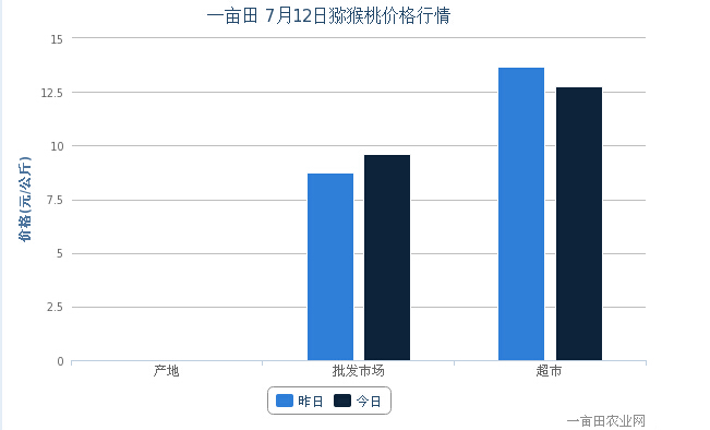 2014年7月12日猕猴桃批发市场价格为9.60元/公斤,超市价格为12.75元/公斤,批发市场价格上调,超市价格下调。