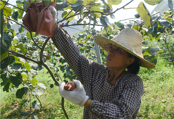 8月17日,在罗城仫佬族自治县东门镇中石村广西红心猕猴桃公司,果农在采收猕猴桃。