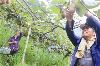新塘村果农周土明、吴远红夫妇说,他们家的猕猴桃是25年前种下去的,有30多亩,只要不是遇到连续干旱、冰冻等恶劣天气,每年有约七八万元的纯收入。