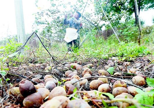 前天下午,楚天都市报记者来到千余亩的散花猕猴桃园,看到地上落了厚厚一层猕猴桃,多数已经发软腐烂。
