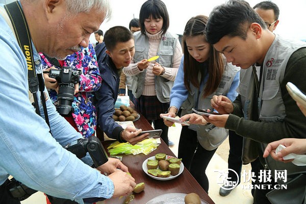 网络达人和媒体记者等在原公镇品尝猕猴桃