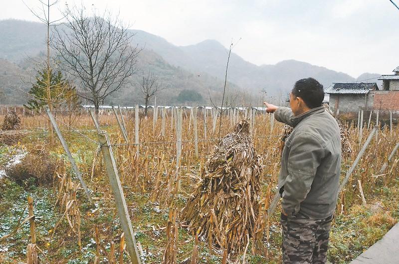 满地的水泥杆和架起的钢丝,其间是枯黄的玉米秸秆或秸秆垛,还有几株死掉的猕猴桃藤蔓缠绕在钢丝架上……11月30日一早,通江县空山乡龙池村,村民龙利天(化名)又一次来到村道旁的田地里,眉头紧锁。