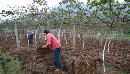 三、栽培方法栽前先挖好定植穴,穴径1米、深40-50厘米,每穴施堆肥40-60公斤、磷肥20克、钙镁磷肥400克。栽植时间从秋季落叶到开春发芽前均可,但以秋季10月下旬和春季2月下旬枝梢伤流期前为好。株行距为4.6×6.0米。为提高早期产量,可按2倍数量密植,成株后间伐,还要混植20%的授粉雄株。