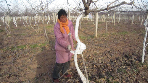 “猕猴桃所谓的‘冬衣’实际上是一种保温带,上面有气孔,经过药物特殊处理过,把这种保温带一层层的裹在猕猴桃树杆上,能保温、杀菌,对冰雹、倒春寒、凝冻等端天气预防效果很好。”贵州罗氏果品有限公司董事长罗兴让介绍说。