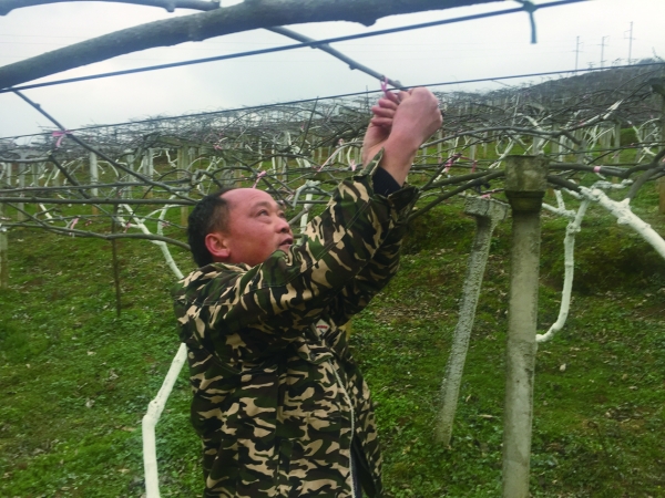 气温已经降到零度,52岁的李兴祥仍坚持一大早就来到自家果林,给猕猴桃树修枝整蔓。“T型架很重要,果子要结得好就得靠它。修枝更重要,我修过的枝,今年能结多少果子,10斤还是20斤,我都心中有数。只能结10斤果子的,我修枝过后能结15斤果子。”李兴祥是平滩村批种植猕猴桃的村民之一,他的果树“年龄”大的已经23岁了。现在李兴祥一家三口人都是村里出了名的“果树专家”,常有农户“请”他们去给猕猴桃修枝,一次“技术上门”,服务费300元。李兴祥说,要是他和老婆、儿子全家一起出动,一天光是“赚外快”就有近千元。