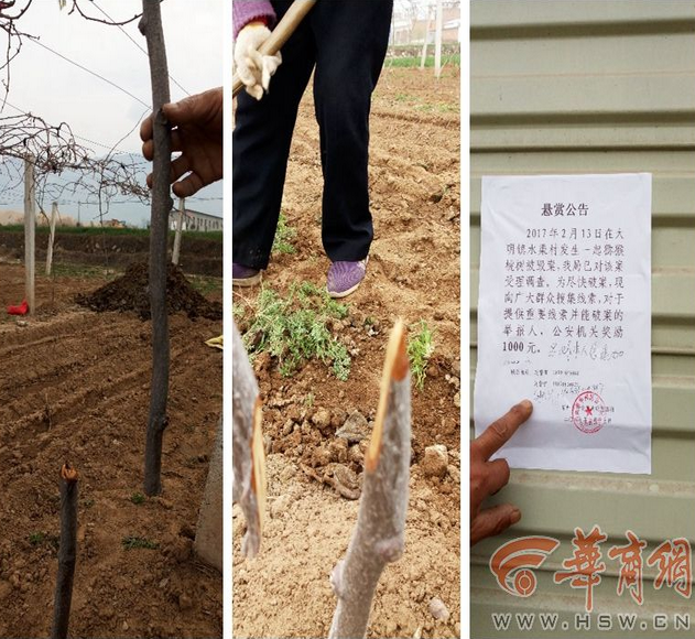 发现树遭砍后,闵师傅向当地辖区派出所报了警。在村口一商店门口,还张贴着警方的悬赏公告,其中称:2月13日在大明镇水渠村发生一起猕猴桃树被毁案,该局已对该案受理滴哦草。为尽快破案,先向广大群众征集线索,对于提供重要线索并能破案的举报人,公安机关奖励1000元,落款时间为2月17日,同时加盖有华州区公安局大明派出所的公章。