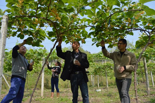 福建延平区人工辅助授粉,能克服猕猴桃雌雄花期不遇和授粉不良的问题。同一果园雄花一般比雌花早开2~3天,猕猴桃的花期特别短,年份长的可以达到1周以上,年份短的只有3~5天,一旦猕猴桃授粉机会错过,全年收获就无从谈起,所以提前收集花粉,进行人工辅助授粉是理想的措施。