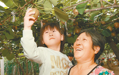 每年初秋,猕猴桃挂满枝头,毛茸茸,圆乎乎。摘一颗品尝,口感纯正,皮薄肉青,甜里透点儿酸。放几天再吃,碧绿晶莹,柔嫩多汁,满口香甜,入口即化。