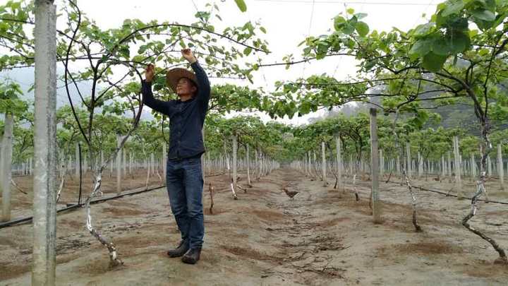 顺着田间的水泥横路,沿路绿意不断。路的一旁,成片的红心猕猴桃树叶连结成荫。伸直双手便能触碰到头上的红心猕猴桃树,瘦长的树干挂在由石柱条搭建的铁丝上,树干枝头花蕊簇拥而生。