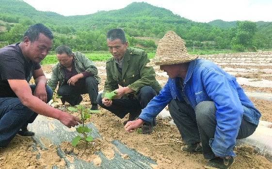 5月 10日下午,记者在花花庙村路边看到一大片土地已经栽上了猕猴桃苗子,还套种了红薯等,张建斌蹲在地里给农民指导栽植技术 。张建斌告诉记者,栽植猕猴桃效益明显,每亩效益相当于种玉米的 8到 10倍。今年 3月栽植苗木时,他雇了 50多个劳力,村镇干部全部上阵帮忙,不到四天时间苗子全部栽完。 3月中旬,麟游下了一场暴风雪,没想到苗子非常抗冻,成活率达到了 98%,比在周至种植的成活率还高。