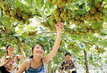 8月25日,苍溪县元坝镇将军村猕猴桃树上硕果累累。据了解,将军村共种植猕猴桃500余亩,其中投产200亩,产量200余吨,产值3百余万元。两年之后余下300亩猕猴桃也将投产,产量将会翻番。图为猕猴桃采摘节上,采摘猕猴桃的游客喜笑颜开。