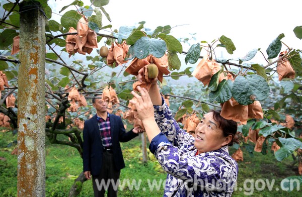 三江村民余泽友夫妇正在田间查看猕猴桃长势