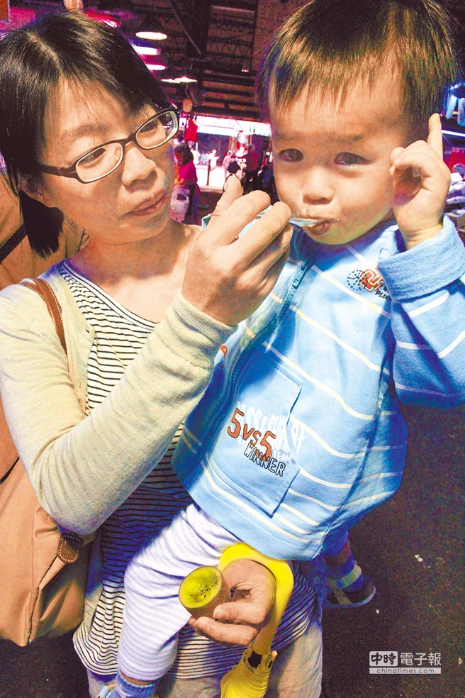 妈妈喂儿子吃猕猴桃,小朋友高兴比着手势。(记者李锌铜摄)