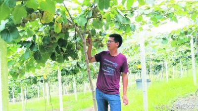 图为吴德发在猕猴桃园查看果子成熟情况。