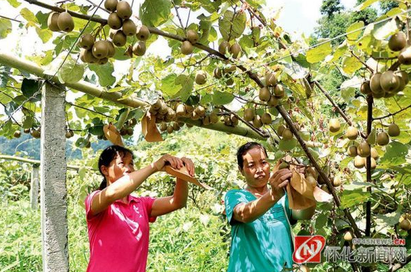 8月5日,麻阳富田坳村红心猕猴桃果园,村民们正在给猕猴桃套袋。目前,富田坳村的猕猴桃面积发展到了600多亩。当地群众依托高海拔、零污染的原生态环境,专注种植无膨大素、无增甜剂、无农药“三无”猕猴桃,声名远播。