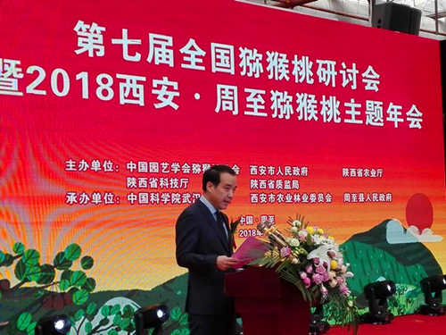 金秋九月,地处秦岭北麓的周至县又迎来了一年中的猕猴桃丰收季。一路向西,道路两旁绵延至山的成片猕猴桃园直扑眼帘,绿树枝头硕果累累,吸引着四面八方来客尝鲜品鉴。9月17日—19日,由园艺学会猕猴桃分会、西安市人民政府、陕西省农业厅、陕西省科技厅、陕西省质监局主办,科学院武汉植物园、西安市农业林业委员会、周至县人民政府承办的第七届猕猴桃研讨会暨2018年西安•周至猕猴桃主题年会在周至楼观召开。国内外高校科研院所专家学者、猕猴桃主产区代表、国内知名果品销售龙头企业客商以及当地果农千余人齐聚周至,共襄大计、共话发展,促进猕猴桃产业上档升级,进一步提升周至猕猴桃影响力和知名度,助力广大群众增收致富奔小康。