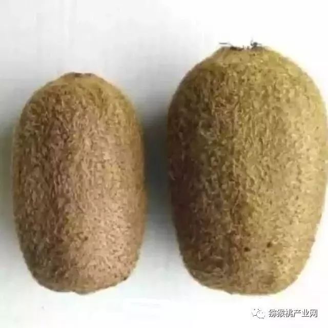 二、看果型:使用大果灵膨大剂的猕猴桃果型不正,一是果脐较为突出,形如鸭嘴;二是果身肥大变形成曲线,大腹便便。而未浸果的猕猴桃果型端正,果脐不突出或突出较少,鸭嘴不明显;果身两端大小一样,两边平行成直线。上述特征越明显,使用浓度越高。如(图一)左边未浸果的,两端大小一样,右边浸果的腹部变大,鸭嘴明显。