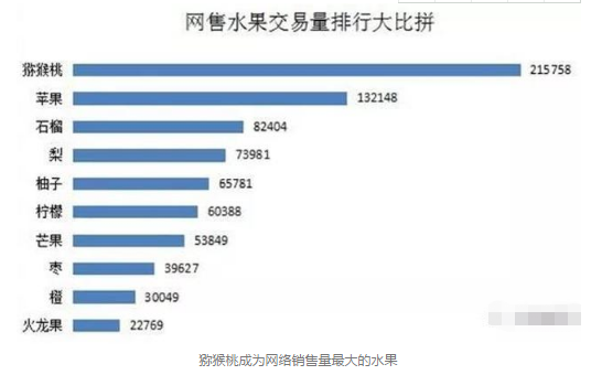 一方面,总产量来看。虽说目前猕猴桃产量超过260吨,但平坦到每个人头上也就人均才2公斤。这比起苹果的人均33公斤、柑橘27公斤,简直是小巫见大巫。并且从近年的水果消费情况来看,猕猴桃成为第六大水果,仅次于西瓜、苹果、葡萄、柑橘和香蕉。猕猴桃更成为近几年网络销售量大的水果,这足以说明猕猴桃已经成为"大宗水果",市场空间还很巨大。