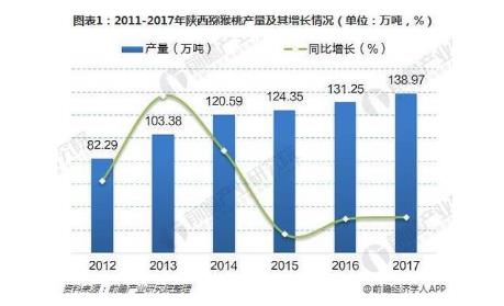 世界猕猴桃的故乡在,猕猴桃的原产地在陕西,陕西猕猴桃的优生区在秦岭北麓一带。陕西地理环境优越,地形南北狭长,自然气候条件独特,具有生产多种优质果品的自然条件。2011-2017年,陕西省猕猴桃产量呈现逐年增长的态势。2017年,陕西省猕猴桃产量达138.97万吨,较上年增长5.9%。目前,陕西猕猴桃产业规模和产量稳居位。