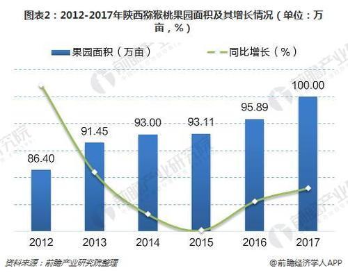 秦岭北麓是猕猴桃优生区,也是猕猴桃产业风向标。陕西猕猴桃产业在乃至世界都占有一席之地,陕西在优化升级周至、眉县等猕猴桃原有产区的同时,又采取了“东扩南移”战略。近年形成了老产区努力转型升级、新产区高标准、高起点快速发展。2012年以来,陕西省猕猴桃果园面积逐年扩大;2017年,陕西省猕猴桃果园面积约100万亩,较上年增长4.3%。陕西创水果栽培模式,建设水果试验站40个,其中猕猴桃试验站9个。
