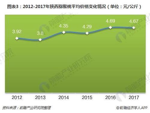 猕猴桃的价格主要受市场供给关系影响。2012年以来,陕西省猕猴桃的平均销售价格在3.9元-4.7元区间呈现波动上升趋势。2012年,陕西猕猴桃平均销售价格为3.92元/公斤;至2016年,陕西猕猴桃平均销售价格升至4.69元/公斤,为近年高均价。2017年,陕西猕猴桃平均销售价格为4.67元/公斤,较2016年下降了0.4%。