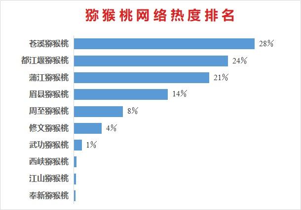 红心猕猴桃起源地——苍溪猕猴桃一举夺冠,成为受欢迎的猕猴桃产区;都江堰和蒲江猕猴桃紧随其后,分别夺得第2名、第3名;陕西眉县猕猴桃获得第4名;周至和修文猕猴桃也得到不少消费者认可。