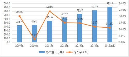 随着新疆地区枣树种植面积的持续增加,枣树种植面积的不断增长,同时随着产品结构和种植技术的改良以及病虫害防控手段的不断改进,枣产量保持了高速增长。预计2009-2015年,原枣产量提升近一倍,2015年将达到913.5万吨,2009-2015年期间的年复合增长率为15.4%。
