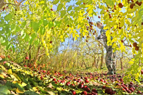 萨吾提•库尔班说:“今年我种植了36亩新疆红枣,经过科学管理,预计今年每亩地的产量达到500公斤,比去年多100 公斤,今年新疆红枣个头也比较大,现在看着满园子的新疆红枣,想想都高兴。”