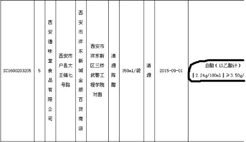 西安德味堂食品有限公司2015年9月1日生产的清源350ml/袋清源陈醋总酸(以乙酸计)不达标。