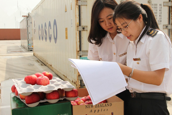 秦韵苹果网讯:近日,自新西兰进口的一批苹果经静海检验检疫局工作人员检验检疫合格,顺利从静海“登陆”进入国内市场。这批苹果重22.6吨,货值6.06万美元,是北京博尼达商贸有限公司由新西兰进口,同时也是天津海吉星农产品物流园进境水果通关查验场正式启用以来批进口的苹果。该办事处提前制定检验检疫工作预案,待货物到达便立即安排专人审核报检单证,之后确认货证相符,经严格检验检疫未发现有害生物后才对货物予以快速放行。图为静海检验检疫局工作人员对进口苹果进行现场查验。