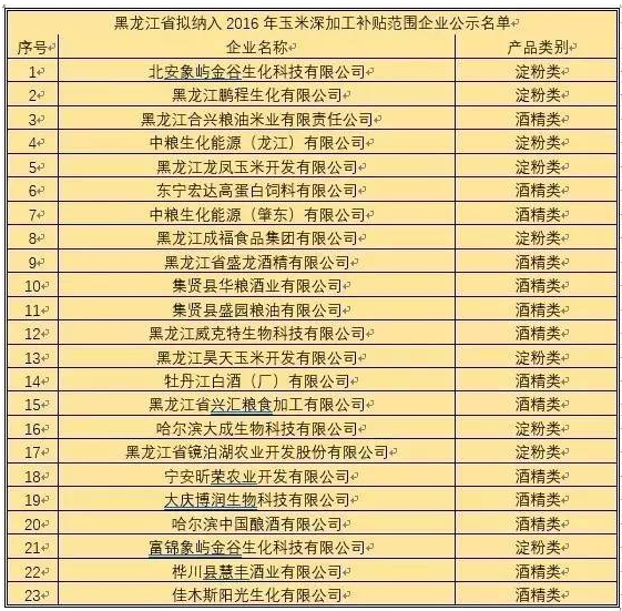 按照《关于做好黑龙江省玉米深加工企业收购加工2016年新产玉米补贴工作的通知》(黑粮工联[2016]115号)要求,经企业申报,市、县政府及省农垦总局审核,省粮食局、省财政厅复审,现将黑龙江省拟纳入2016年玉米深加工补贴范围企业名单予以公示,接受社会监督。公示期为2016年12月16日至2016年12月23日。(一)补贴对象。在全省2015年产品销售收入2000万元及以上或具备年加工能力10万吨及以上,生产淀粉类或酒精类玉米深加工企业范围内确定。纳入补贴范围的企业名单逐级审核公示,接受社会监督。