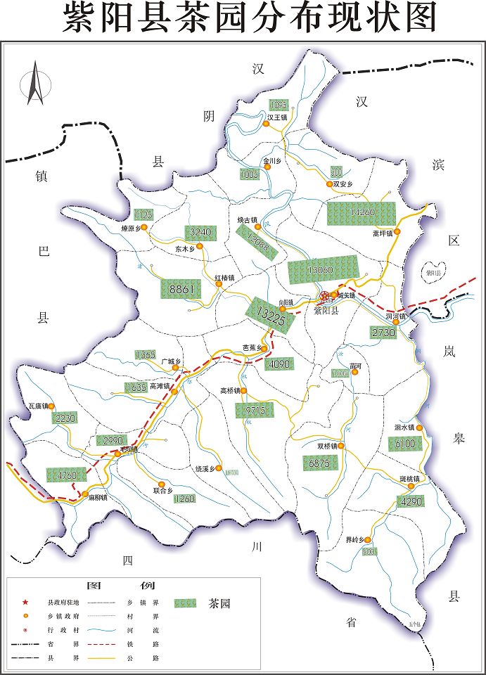 紫阳位于汉水上游,大巴山北麓,北有秦岭、凤凰山阻挡,南有大巴山天然生态林保护,使得这里仍保持着原始的生态环境,紫阳茶大多生长在境内中高山以上和沟壑峡谷之中,这里长年被云雾浓照,日照时间短,雨量充沛,空气中飘散着野花的清香,树林竹海,郁郁葱葱,森林覆盖率达50%以上,各种野生动植物遍布其中。土壤大多为风化岩石的黄沙土,透水性好并含有丰富的矿物质,特别是人体必需的微量元素硒的含量高达3.98mg%kg。正是这样的原始生态环境和土质,为茶树的生长奠定了优良的基础,这也正是紫阳富硒茶品质超群,具有特殊保健功能的原因之一,使之成为我国北缘地带优质的绿茶产区。“十一五”期间,农民纷纷拿出好田好地发展新茶园6.5万亩,全县茶园总面积增长到17万亩。全县有茶农5.2万户、23.4万人,茶叶成为近70%农户的主导产业。全县21个镇已形成14个茶叶基地镇,包括城关、洞河、焕古、麻柳、蒿坪、洄水、斑桃、向阳、红椿、高桥、毛坝、瓦庙、双桥、东木。其中6个镇茶园面积超过1万亩。全县有55个茶叶专业村,茶园106342亩,人均茶园面积达1亩以上(其中有13个村人均茶园面积超过2亩),产茶2110.4吨,产值2.67亿元。