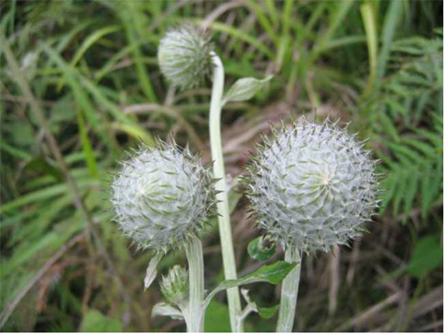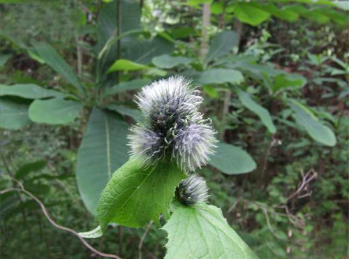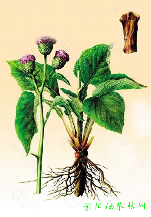 多年生草本,高100-200厘米。主根粗壮,圆柱形,具特殊香气。基生叶县翅状羽裂的长柄,叶片三角状卵形或长三角形,叶缘浅裂或波状;茎生叶阔椭圆形,塞部下延成具翅的炳或无柄。头状花序单生或数个丛生于整项;花筒状,暗紫色;雄蕊5枚;子房下位。瘦果线形,有棱,上端着生一轮黄色直立的羽状冠毛。花期7~8月,果期8~10月。